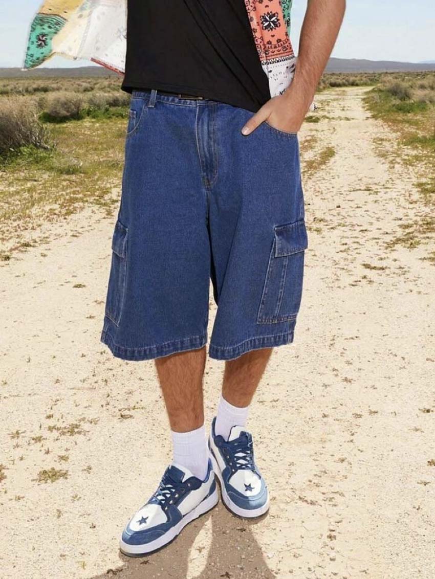 Inspirada nos anos 1990, a bermuda jeans de corte largo e comprimento no joelho retorna com força.