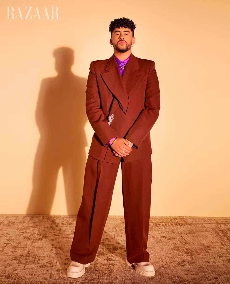 Poucos artistas hoje vestem a própria pele com tanta intenção quanto Bad Bunny. Benito não se veste. Ele performa. Ele provoca. Ele desmonta o guarda roupa masculino tradicional e remonta tudo como se estivesse brincando com peças de Lego douradas, plumas fluorescentes e alfaiataria italiana.