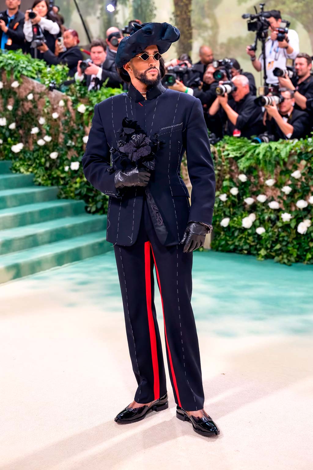 No tapete vermelho do Met Gala, por exemplo, ele já apareceu com capas monumentais e silhuetas que misturam realeza caribenha com alta-costura europeia. Em editoriais e campanhas, seu corpo vira território de experimentação, sem pedir licença.