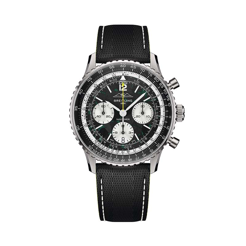 Cada elemento do Navitimer B01 Chronograph 43 Aston Martin Formula One™ Team reflete a performance: detalhes nas cores lima e verde Aston Martin Racing Green, inspirados na pintura da Aston Martin Aramco; uma caixa leve de titânio – a primeira já usada em um Navitimer –- e um mostrador de fibra de carbono inspirado nos materiais encontrados no cockpit de um carro de F1®. A pulseira de couro texturizado remete a um cinto de segurança de corrida, enquanto a visibilidade noturna aprimorada garante a legibilidade do relógio em qualquer condição.