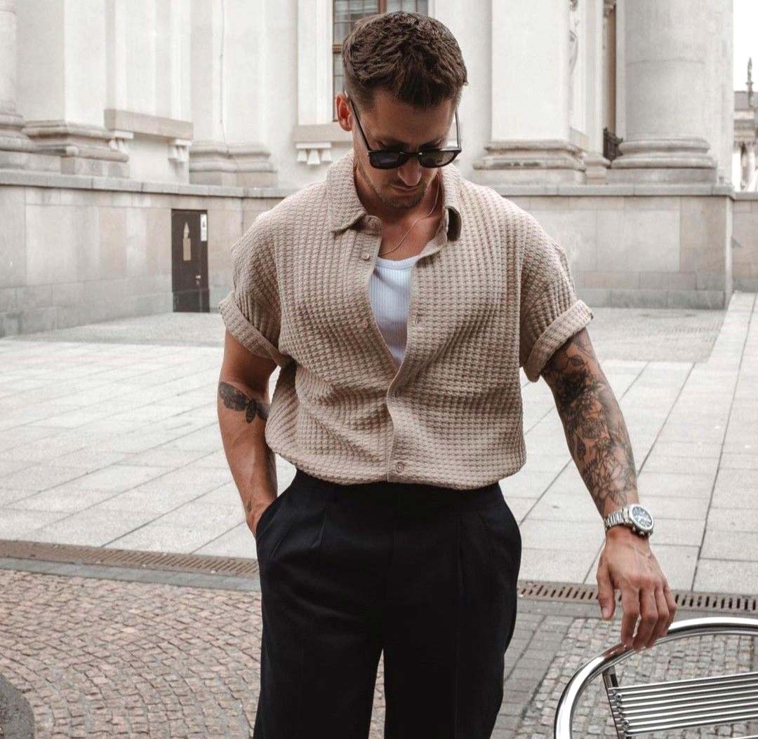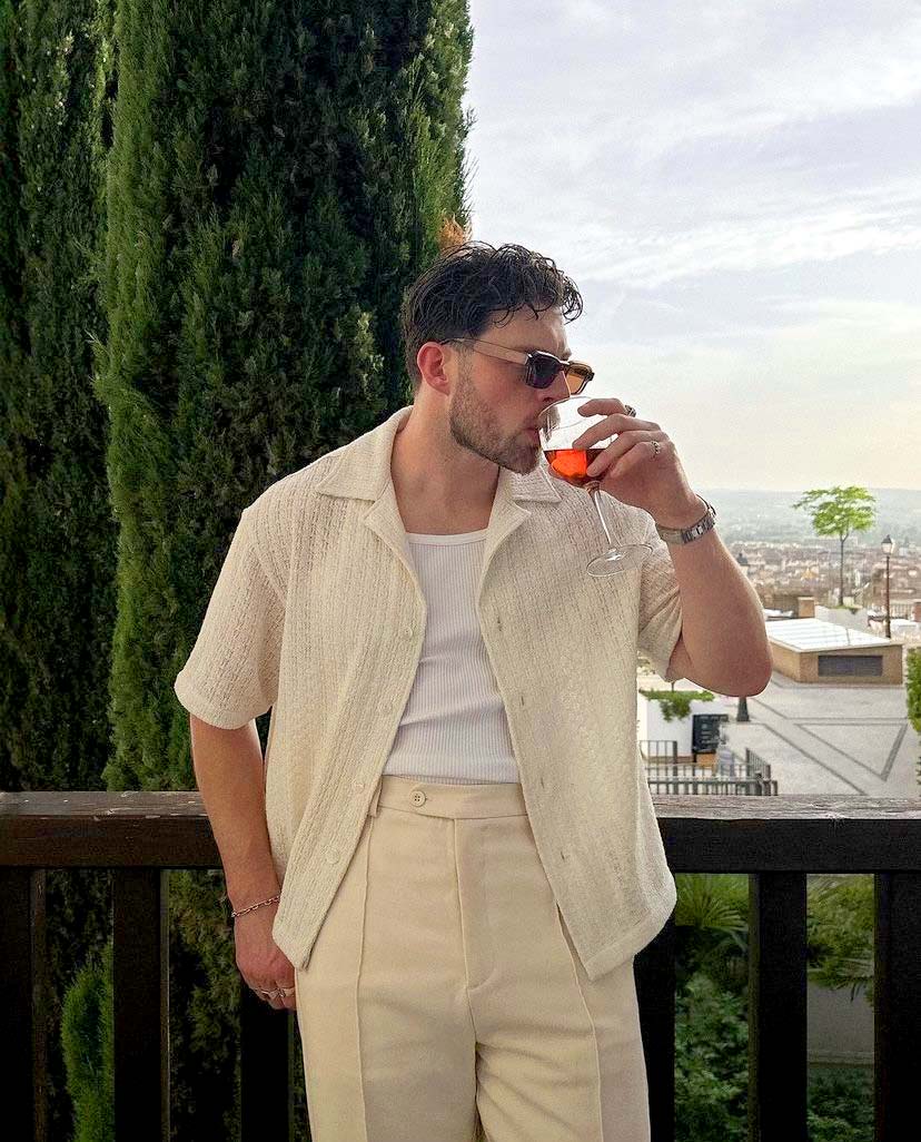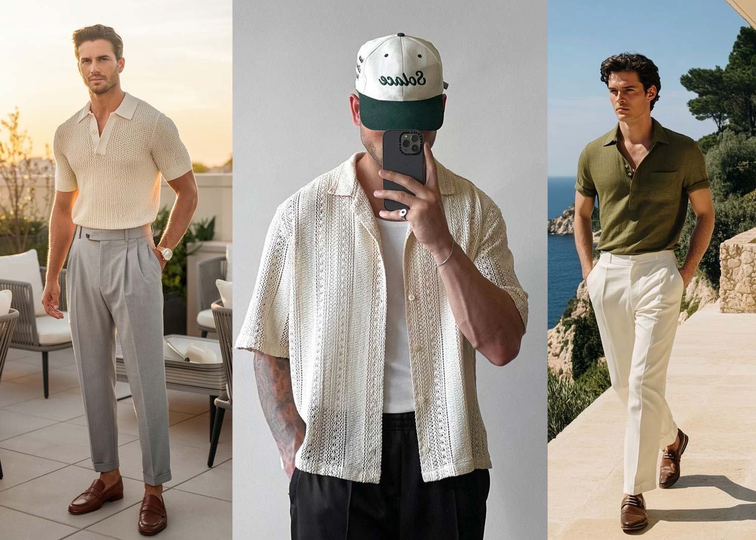 Entre os destaques estão as camisas de linho, que garantem frescor e textura ao look, a clássica camiseta branca sobreposta por uma camisa aberta, criando um visual casual, porém refinado; E, por fim, a polo texturizada (tricô, por exemplo). Combine com calças de alfaiataria em modelagem reta ou chinos, e finalize com mocassins, sandálias de couro, loafers, ou tênis de couro minimalistas.